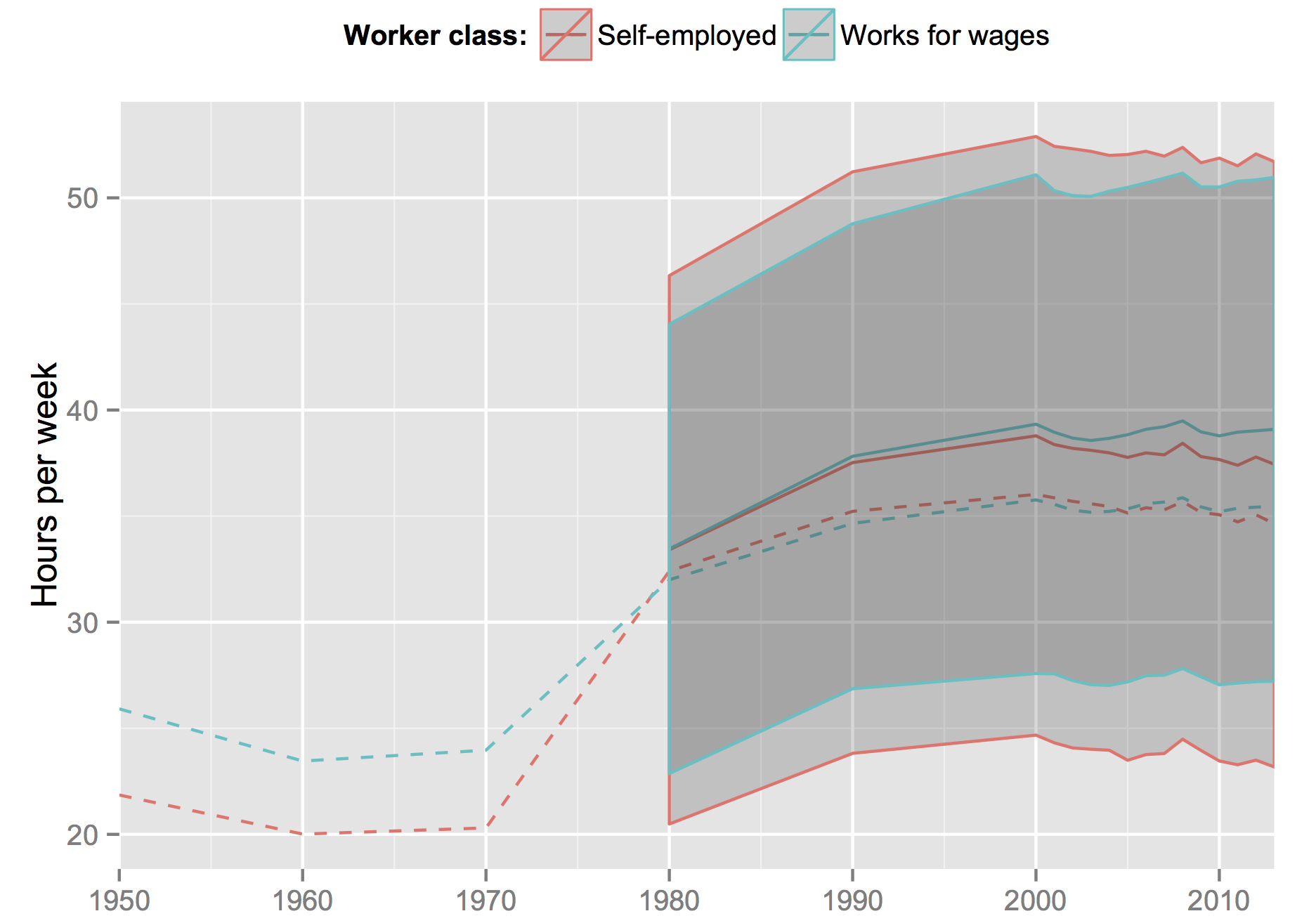 The graph below shows the shift, and that it's not driven by specifically employees or the self-employed. The grey bands show one standard deviation, with a huge range that is even larger for the self-employed.